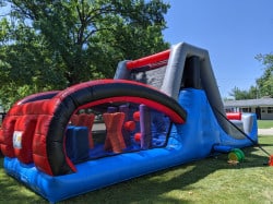 This fun and unique inflatable water slide obstacle course is a combination of two categories of inflatable rides everyone loves and enjoys. Riders will go through countless obstacles and popups, climb up a tall climber and down the slide into a pool. A water mister sprays the riders as they slide down into the fun U shaped splash zone. The perfect addition to a hot summer day!